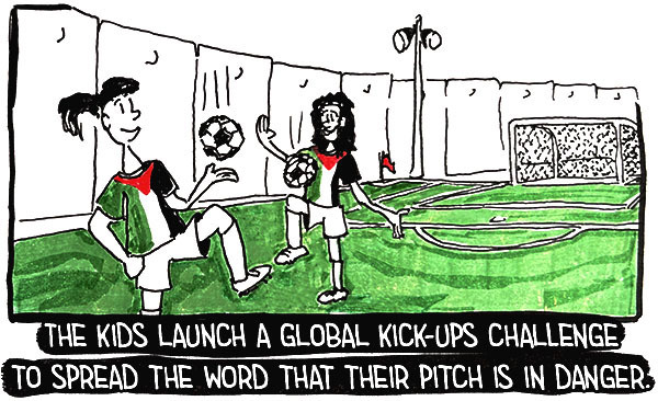 | Dear Dany, | We write to you with wonderful news. The children's football pitch in Bethlehem was not destroyed by Israel's bulldozers!This was made possible thanks to the kids' relentless fight to protect it as well as you, Dany, and the power of this community. Want to know how we turned signatures into a success story? Keep reading. Our designer Zarpa created a storyboard to show you how we helped protect Aida's football pitch: